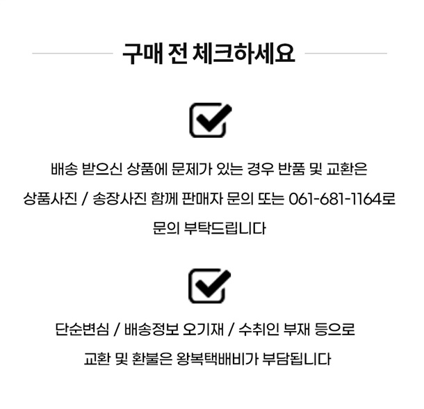 · 변심 교환/반품의 경우 왕복 택배비를 부담해 주셔야 합니다. (택배비 상품별 상이)